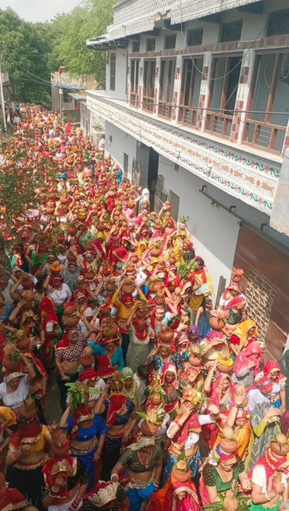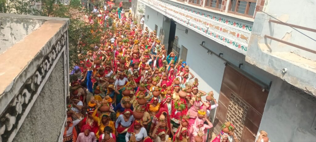 मरुधर हिंद न्यूज (आर.सी.) नीमराना उपखंड के फौलादपुर गांव में बुधवार को बाबा गाय वाला की मूर्ति प्राण प्रतिष्ठा और मंदिर उद्घाटन से पहले एक भव्य कलश यात्रा निकाली गई। इस यात्रा में 551 महिलाओं ने सिर पर कलश रखकर डीजे की धुन पर पूरे गांव में बाबा की आकर्षक झांकियों का नगर भ्रमण कराया। कलश यात्रा के दौरान सैकड़ों ट्रैक्टरों में विभिन्न देवी-देवताओं की मूर्तियां ग्रामीणों के आकर्षण का केंद्र रहीं, जिसमें काफी संख्या में ग्रामीण महिला और पुरुष शामिल हुए।
