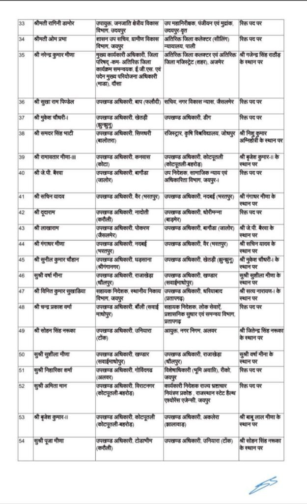 वहीं बृजेश कुमार, जो अब तक कोटपूतली के उपखण्ड अधिकारी के पद पर कार्यरत थे, उनका तबादला कर उपखण्ड अधिकारी, अकलेरा (झालावाड़) के रूप में पदस्थापित किया गया है।