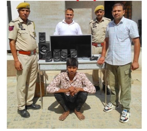 अभियुक्त के कब्जे से चोरी का माल — एक LG LED, म्यूजिक सिस्टम और 6 स्पीकर बरामद किए गए।