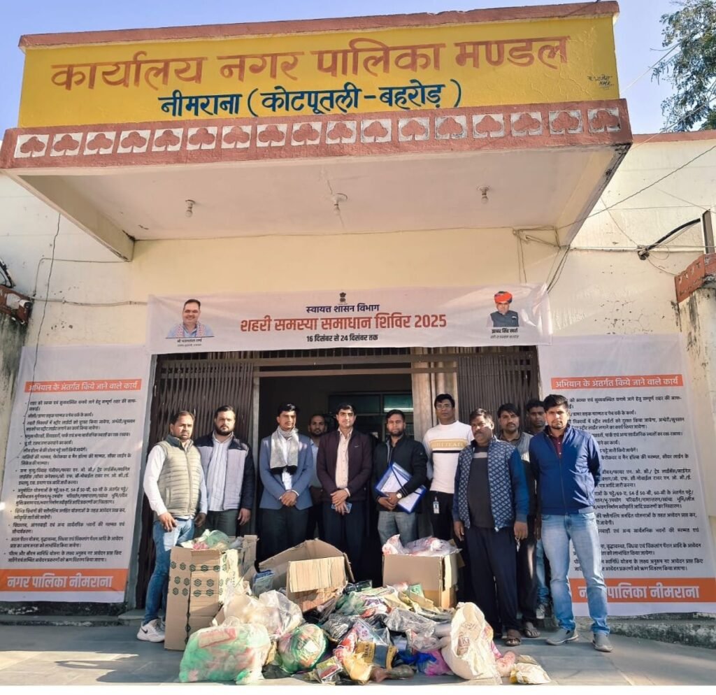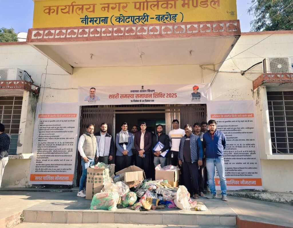 मरुधर हिंद न्यूज  (रमेशचंद) नीमराना।  नगर पालिका नीमराना के अधिशासी अधिकारी विष्णु कुमार गुर्जर के निर्देश में और पॉल्यूशन कंट्रोल बोर्ड से वैज्ञानिक अधिकारी चेतन आर्य व अन्य स्टाफ के सहयोग से आज दिनांक 16 दिसंबर 2025 को नीमराना में सिंगल यूज प्लास्टिक जप्त करने के लिए विशेष अभियान चलाया गया।