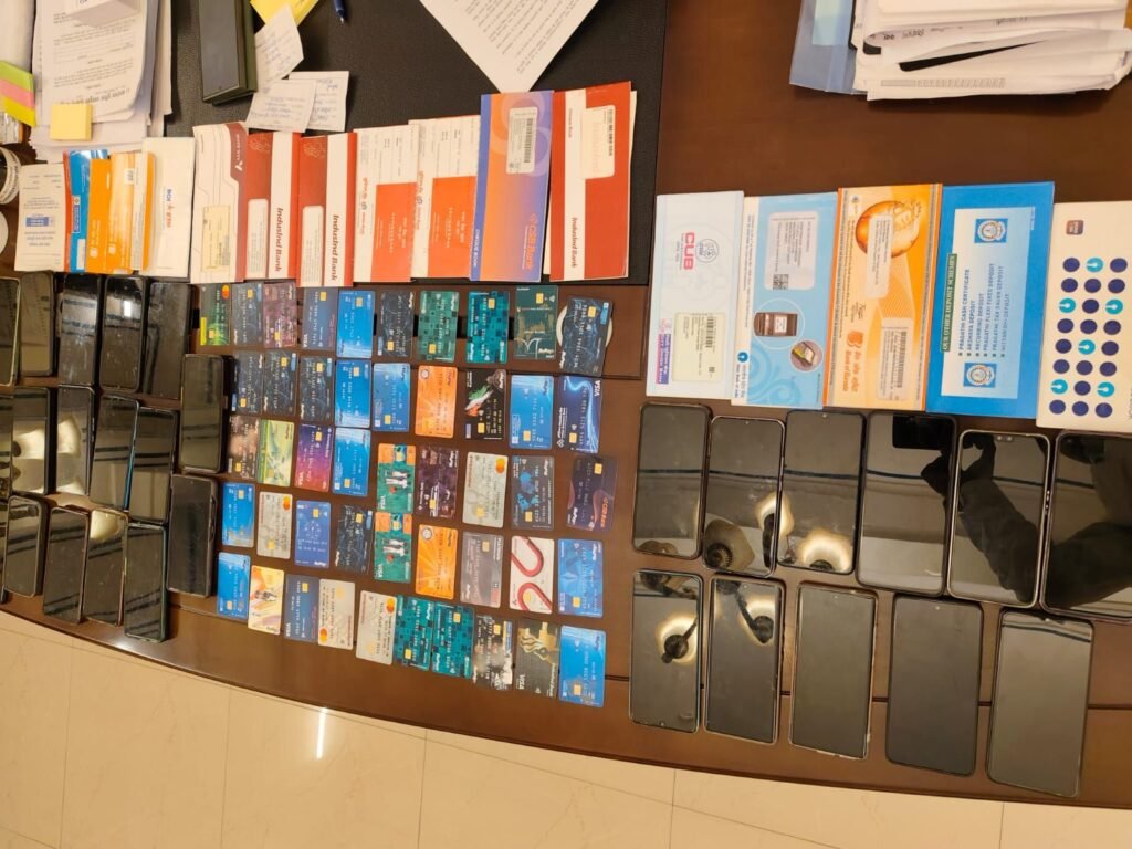 दोनों थानों की कार्रवाई में कुल 9 शातिर साइबर अपराधी गिरफ्तार किए गए, जबकि 6 आरोपियों को 170 बीएनएस में डिटेन किया गया। पुलिस ने आरोपियों से 56 एटीएम कार्ड, 32 मोबाइल, 8 सिम कार्ड, 8 चैक बुक, 11 पासबुक, 1 लैपटॉप, 2 रजिस्टर एवं फर्जी कंपनी की सील मोहर बरामद की।