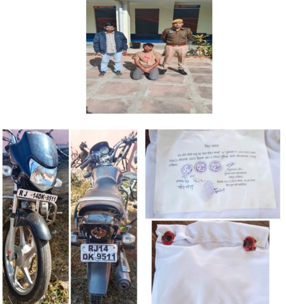 पुलिस टीम ने सीसीटीवी फुटेज, तकनीकी साक्ष्य और मुखबिरों की सूचना के आधार पर 14 दिसंबर 2025 को मुख्य अभियुक्त महेन्द्र मीणा (22) निवासी महेशपुरा को गिरफ्तार किया। पूछताछ में उसने एक किशोर के साथ वारदात करना स्वीकार किया, जिसके बाद किशोर को भी निरुद्ध कर लिया गया। दोनों की निशानदेही पर लूटा गया जंतर और मोटरसाइकिल बरामद की गई। किशोर को बाल सुधार गृह भेज दिया गया है, जबकि मुख्य अभियुक्त से अन्य वारदातों के संबंध में पूछताछ जारी है।