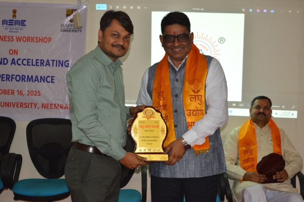 मरुधर हिंद न्यूज (रमेशचंद्र) नीमराना। लघु उद्योग भारती – नीमराना इकाई और राफेल यूनिवर्सिटी ने एमएसएमई मंत्रालय, भारत सरकार एवं राजस्थान सरकार के सहयोग से आरएएमपी (Raising and Accelerating MSME Performance) कार्यक्रम पर एक अत्यंत सफल और प्रभावशाली फिजिकल अवेयरनेस कार्यशाला एवं दीपावली स्नेह मिलन समारोह का आयोजन राफेल यूनिवर्सिटी, नीमराना में किया। इस कार्यक्रम में उद्योग जगत के विभिन्न हितधारकों ने सक्रिय भागीदारी दिखाई।