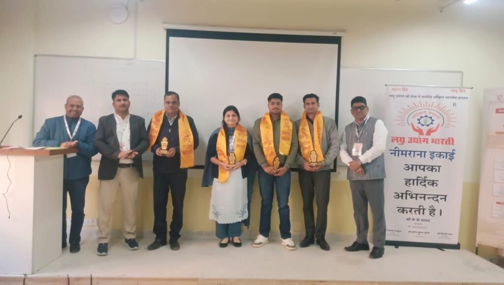 कार्यक्रम को सफल बनाने में सहयोग देने वाले कर्मवीर योद्धाओं को माला व पटका पहनाकर सम्मानित किया गया। इस अवसर पर लघु उद्योग भारती नीमराना इकाई के पदाधिकारी, एनआईआईटी यूनिवर्सिटी के शिक्षाविद, स्थानीय उद्योग प्रतिनिधि एवं बड़ी संख्या में प्रशिक्षार्थी उपस्थित रहे।