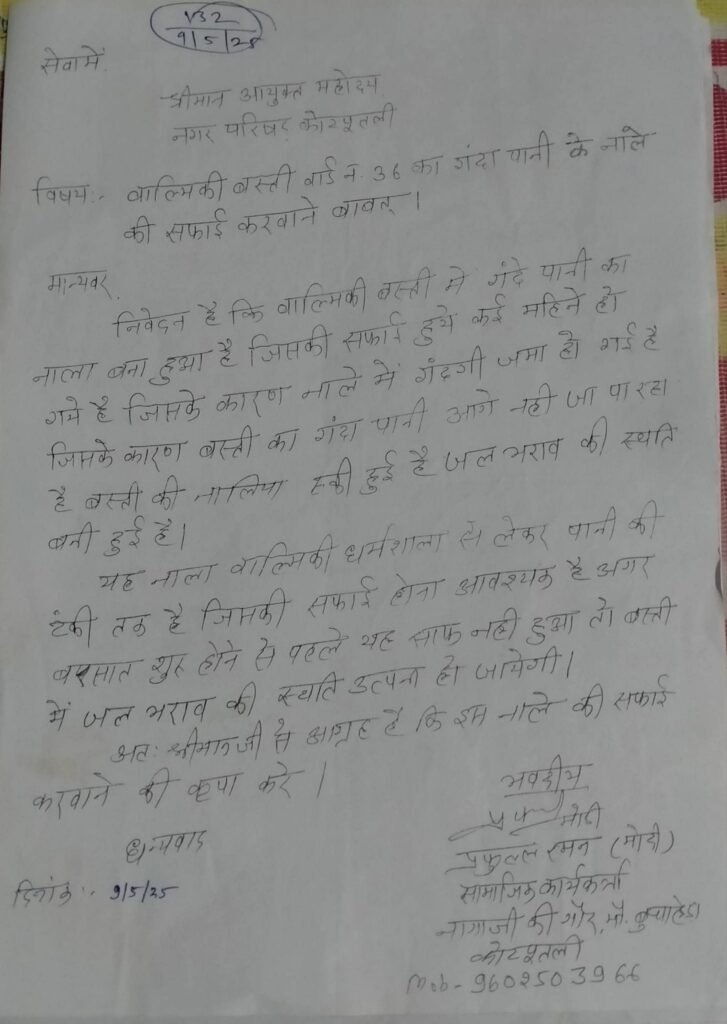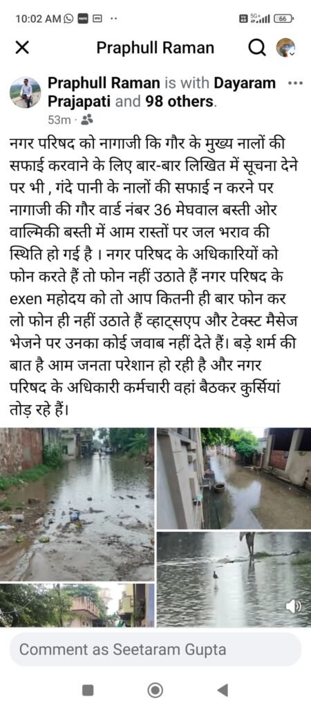 वार्ड नंबर 36 नागाजी की गौर स्थित मेघवाल बस्ती और वाल्मीकि बस्ती में नालों की सफाई नहीं होने से आम रास्तों पर जलभराव की गंभीर स्थिति बन गई है। गंदे पानी के कारण गलियां दलदल में तब्दील हो गई हैं, जिससे लोगों का घर से बाहर निकलना मुश्किल हो गया है। लगातार हो रही परेशानी से तंग आकर कॉलोनीवासियों ने नगर परिषद को कई बार लिखित शिकायत दी, मगर आज तक कोई कार्रवाई नहीं हुई।
