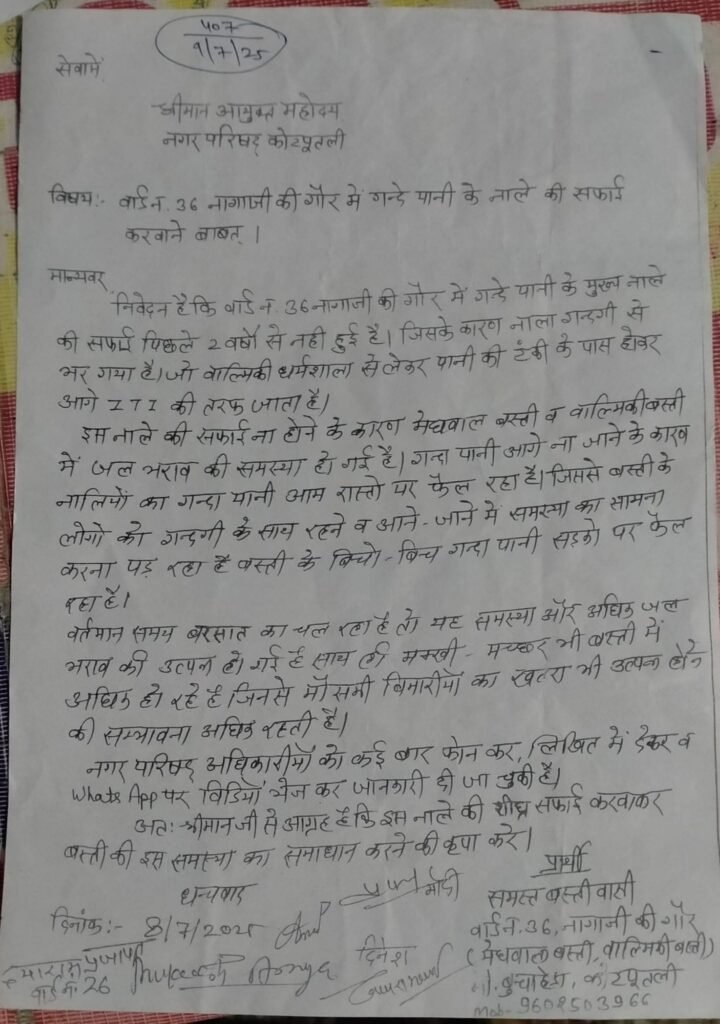 कॉलोनीवासियों का कहना है कि नगर परिषद को 9 मई 2025, 9 जुलाई 2025 और 29 जुलाई 2025 को अलग-अलग बार शिकायत दी गई, लेकिन अब तक सफाई का कोई काम शुरू नहीं हुआ। हालात इतने खराब हैं कि बरसात के मौसम में जलभराव के कारण बच्चों और बुजुर्गों का आना-जाना भी मुश्किल हो गया है। बीमारियों का खतरा भी मंडरा रहा है, मगर अधिकारी मौन साधे बैठे हैं।