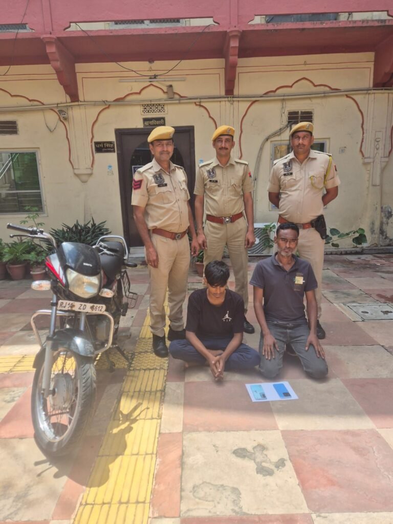जयपुर, 08 सितम्बर। थाना माणक चौक पुलिस ने वाहन चोरी कर मोबाइल छीनने वाली गैंग के दो शातिर बदमाशों को गिरफ्तार किया है। पुलिस ने इनके कब्जे से चोरी की मोटरसाइकिल और छीने गए दो मोबाइल फोन बरामद किए।