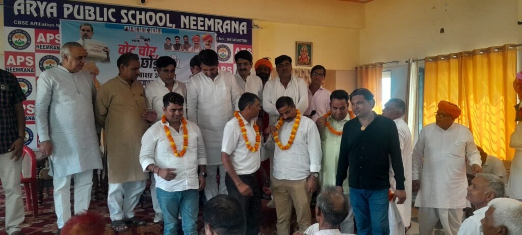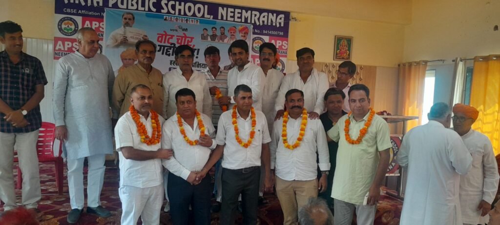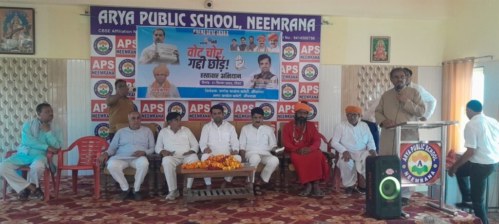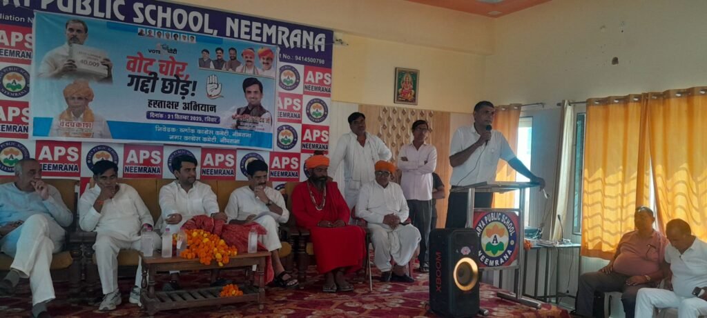 वोट चोर गद्दी छोड़ हस्ताक्षर अभियान के तहत कार्यक्रम में विशिष्ट अतिथि के रूप में पंकज दाधीच समन्वयक प्रदेश कांग्रेस कमेटी, विधि एवं मानवाधिकार प्रदेश प्रकोष्ठ के एडवोकेट राकेश यादव राजस्थान पंचायती राज पूर्व प्रदेश अध्यक्ष नीमराना नगर पालिका वाइस चेयरमैन हरि सिंह सैनी नीमराना पूर्व सरपंच एवं कांग्रेस जिला महासचिव अशोक मुद्दगल, राजस्थान सरपंच संघ के प्रदेश उपाध्यक्ष उमाशंकर यादव भोलेनाथ महाराज रहे। कार्यक्रम के दौरान समाजसेवी केशव देव प्रजापति नाघोड़ी सिलारपुर, कांग्रेस ब्लॉक अध्यक्ष संजय चौहान,घीलौट सरपंच परमानंद यादव, नीमराना पूर्व सरपंच सतीश मुद्दगल, सिलारपुर पूर्व सरपंच एडवोकेट धर्मवीर रेवाड़िया, विष्णु सोनी, नीमराना नगर उपाध्यक्ष संजय यादव, सुरेंद्र भंडारी पंचायत समिति सदस्य, कर्मपाल सिंह चौहान, समाजसेवी अंकित यादव, किरण सामरिया, मौजीराम यादव ,भवानी योगी, सुमेर यादव ,डॉक्टर अशोक यादव ,संजय यादव ,ईश्वर कान्हावास सहित काफी संख्या में कांग्रेस के कार्यकर्ता मौजूद रहे।